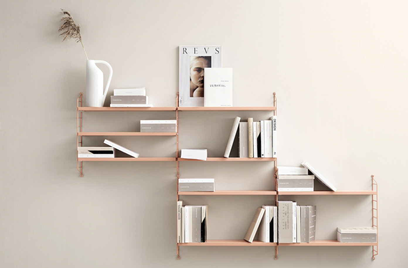Stringhyllan går att kombinera på hur många sätt som helst. Det går bland annat att sätta in bredare hyllplan som blir ett skrivbord. Annars går det utmärkt att sätta dem lite lägre och nära sängen som ett väggfast sängbord.